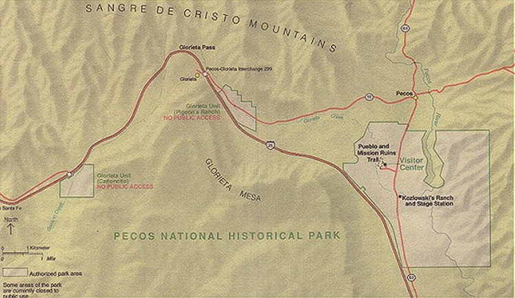 The Glorieta Battlefield is located east of Santa Fe along NM Highway 50 (originally the Santa Fe Trail). Because the presence of highway traffic makes the site dangerous to pedestrians, unescorted visitors are prohibited by park policy.